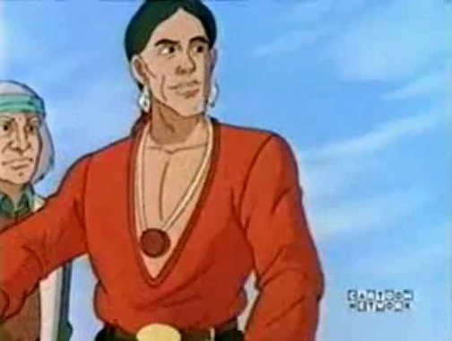 Sky Runner is a Native American singer, with long black hair pulled back into a plaited pony-tail with a red band. He wears silver earrings in the shape of feathers, a red shirt open to bare the necklace on his chest, and black pants.
